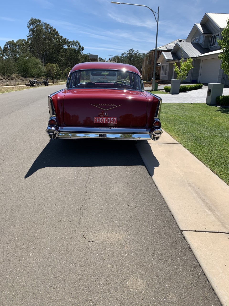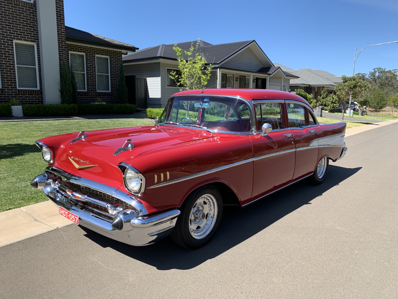 A beautiful, sleek, well looked after 4 door 57 Chevrolet Bel Air with red exterior and red vinyl interior.