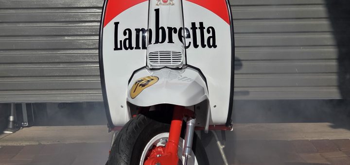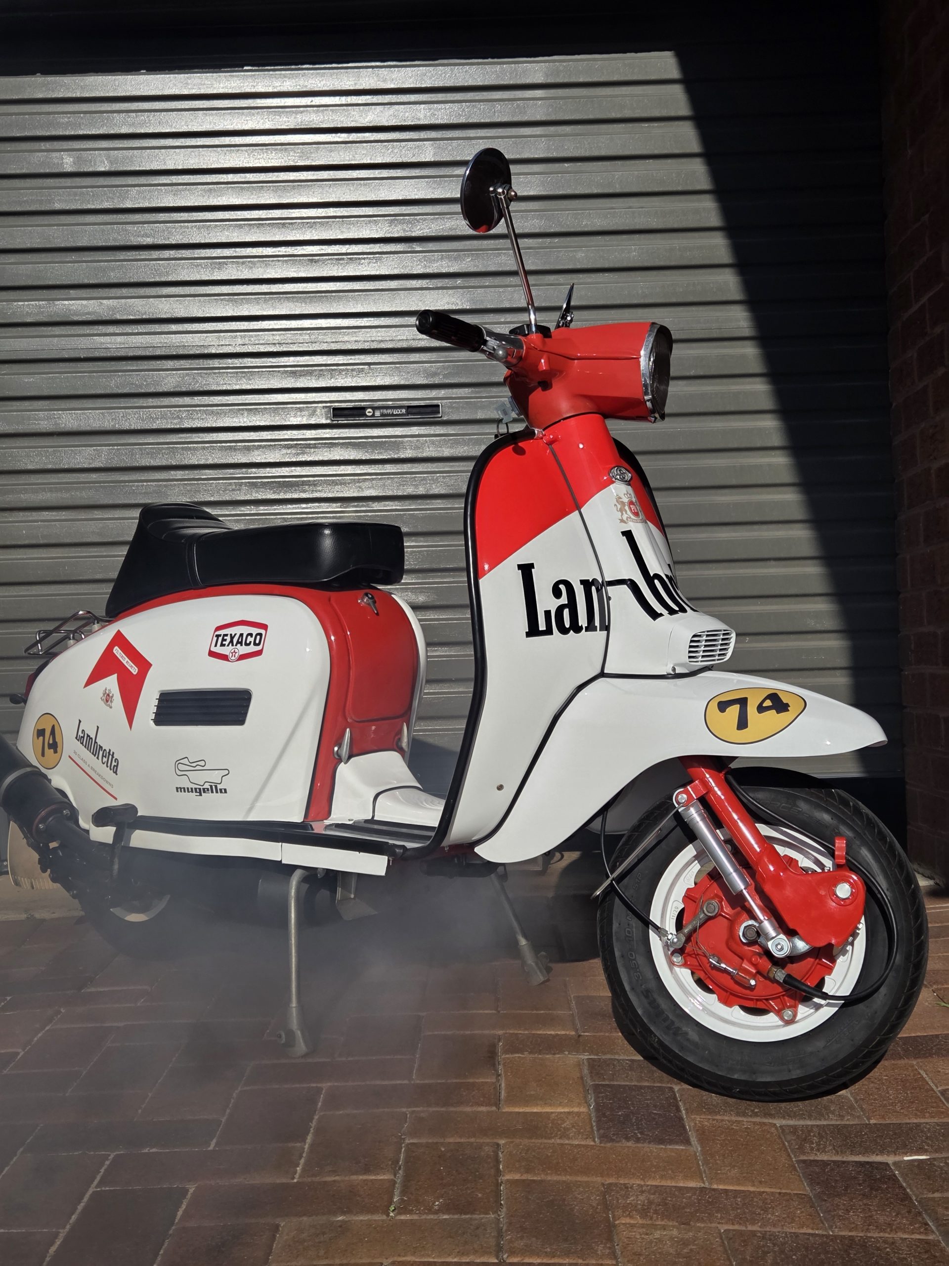 The scooter has red frame and red/white bodywork, recently resprayed with custom vinyl graphics.